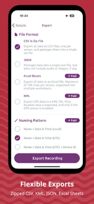 Voor gebruikers die behoefte hebben aan nog meer functionaliteit, biedt Sensor Logger de Plus- en Pro-abonnementen. Hiermee ontgrendelt u onbeperkte opnamemogelijkheden en toegang tot aanvullende exportformaten zoals Excel, KML en SQLite. Profiteer van geavanceerde sensorconfiguraties, aanpasbare opnamewerkstromen en de mogelijkheid om grotere studies op te zetten met meerdere deelnemers. Deze premiumfuncties bieden de flexibiliteit om Sensor Logger volledig af te stemmen op uw unieke projecten en onderzoek, van gepersonaliseerde naamgevingssjablonen tot uitgebreide ondersteuning voor Bluetooth-apparaten. Met Sensor Logger, ongeacht uw behoeften, heeft u altijd de controle over uw data.